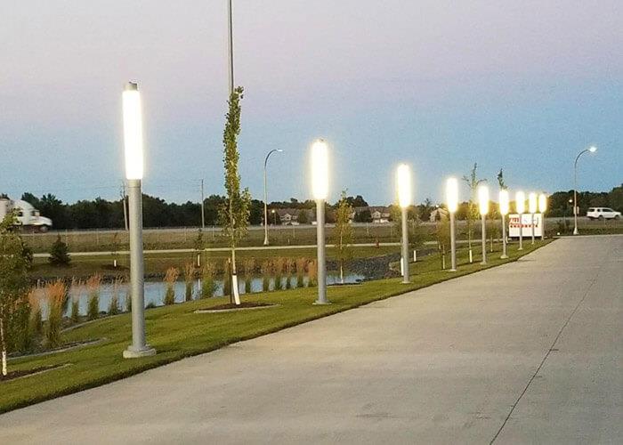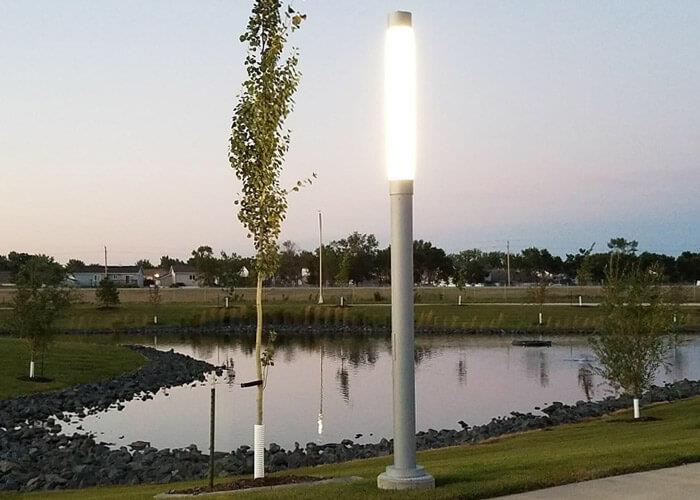 attaches cleanly to the ground surface without a visual footing. See luminaire photos.