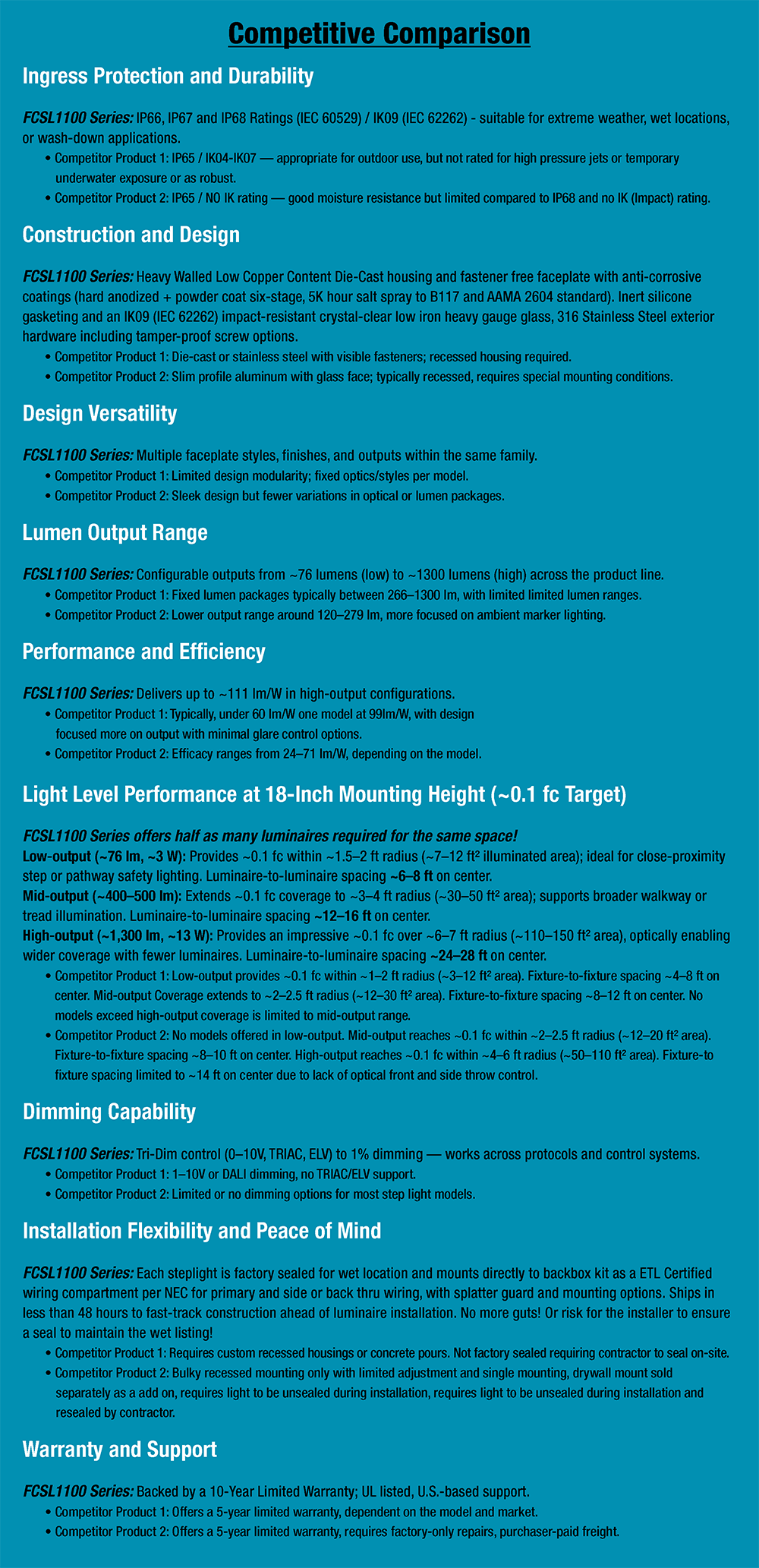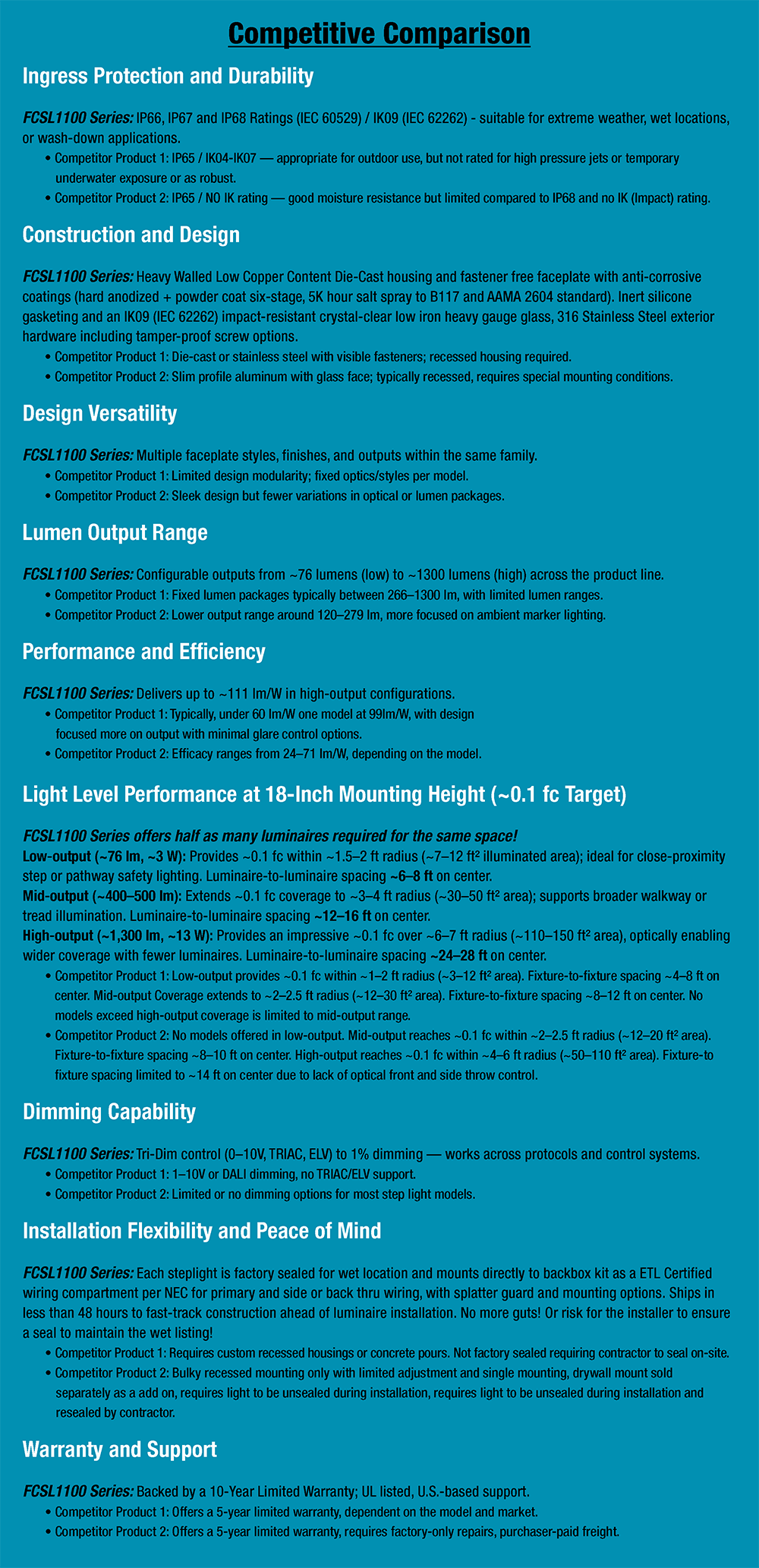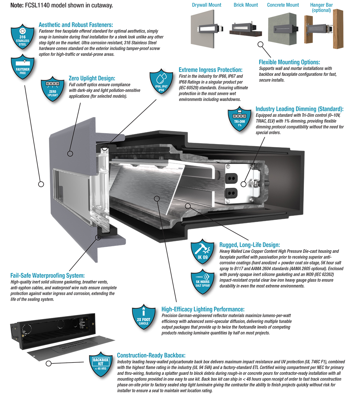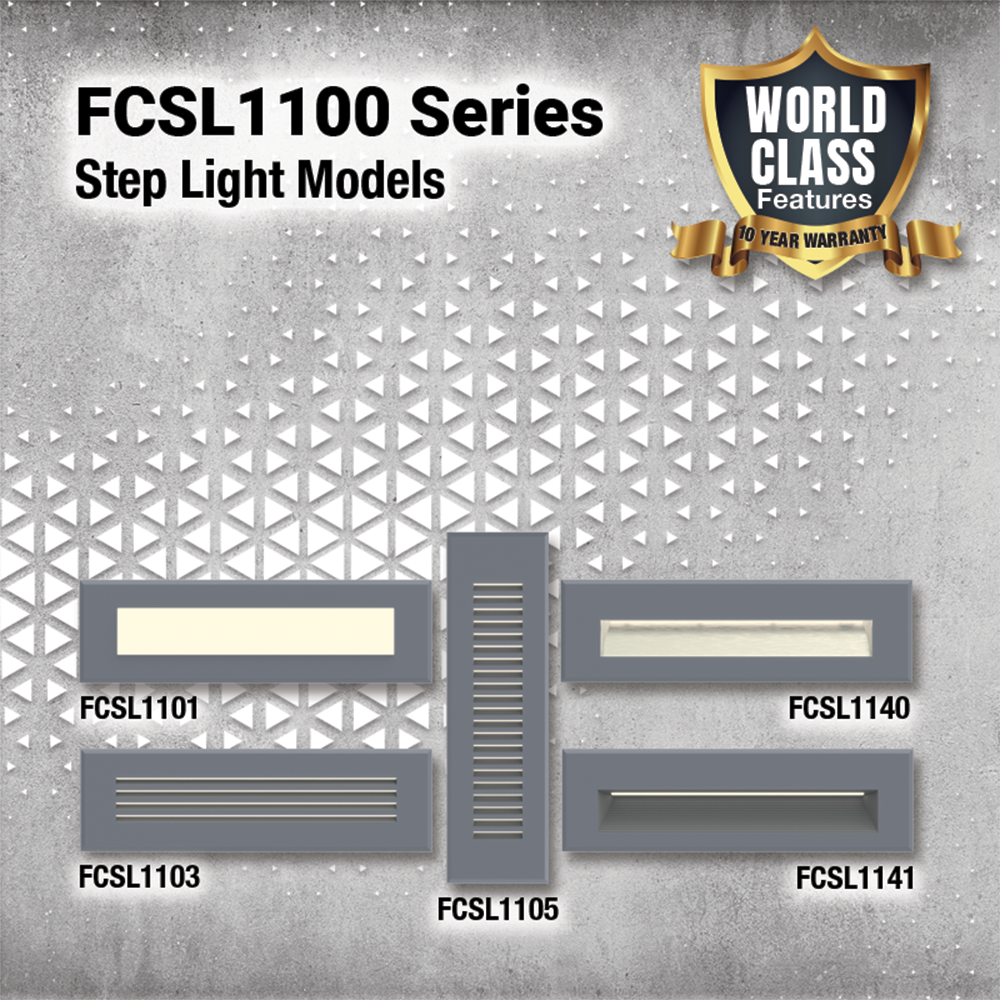 Introducing the next generation of Step Lights from FC Lighting… the FCSL1100 World Class Series! The new FCSL1100 World Class Series Step Lights from FC Lighting are enhanced with improved performance and ease of installation. Featuring a marine grade, corrosion resistant, heavy-walled, high pressure, die-cast aluminum housing with a snap-in screwless faceplate. Optimized LED & driver pairing ensures long life, and a universal back box with simple, snap-fit installation.
