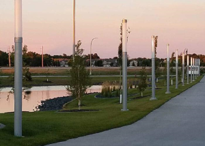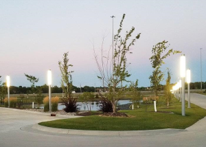 attaches cleanly to the ground surface without a visual footing. See luminaire photos.