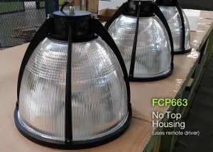 FCP663 LED Pendant, using the ribbed acrylic (RA) shade option, provides high-bay lighting for everything below while adding significant ambient light above and around the luminaire as well. Albeit the architectural appearance of the P663 is much more attractive than most high bay solutions. It has a simple yet decorative presence. And, unlike the FCP662, it uses a remote driver to eliminate the top cylindrical housing.